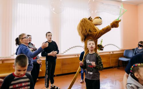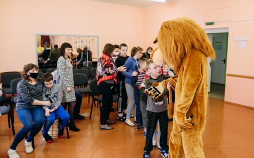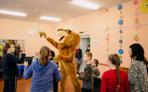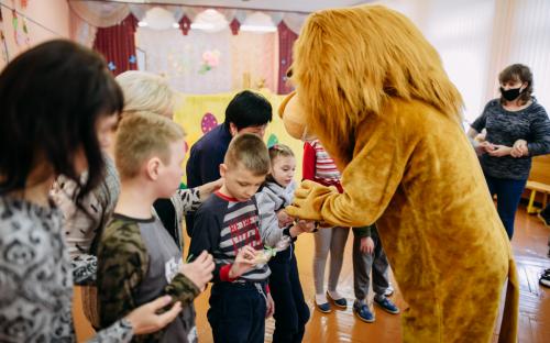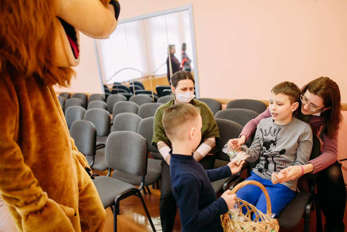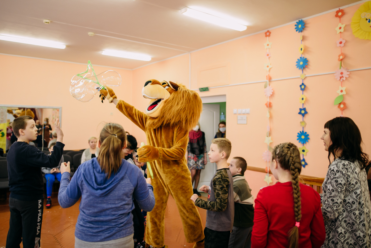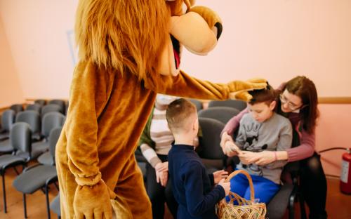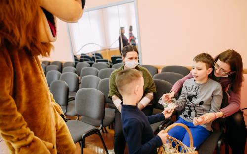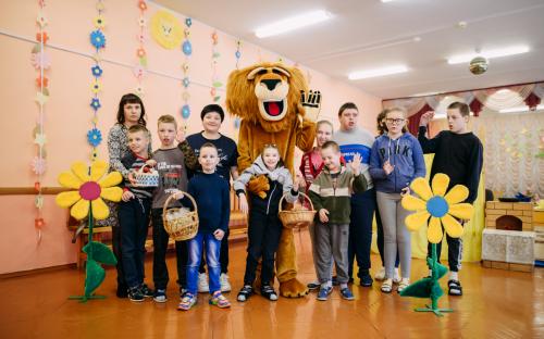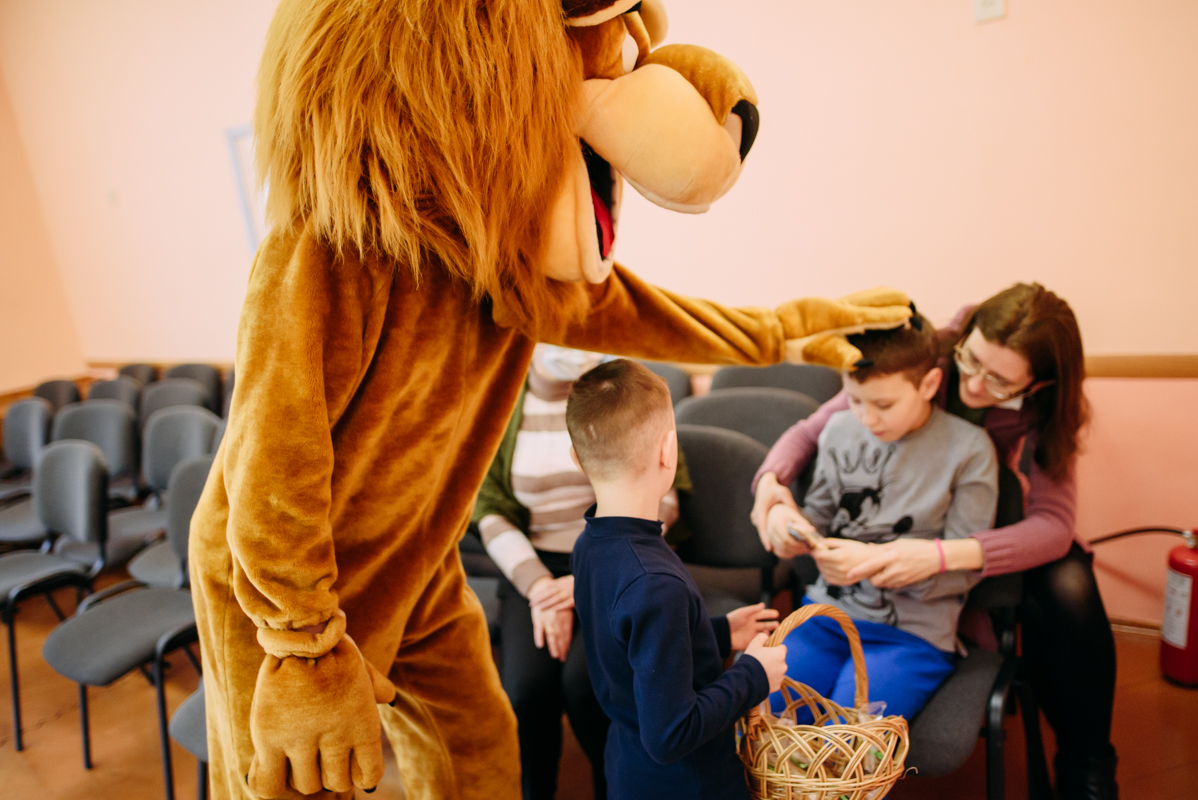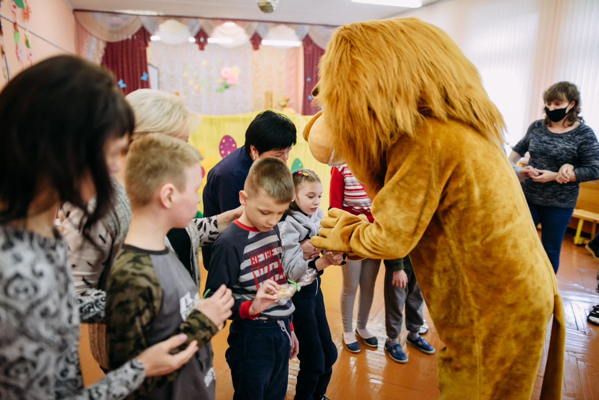 Ребята с увлечением посмотрели театральную зарисовку "Пасхальный колобок". Лев Алекс развлекал детей танцами и играми с мыльными пузырями. В свою очередь священник Николай Савицкий поздравил всех со Светлым Христовым Воскресением. В завершение всем были вручены сладкие подарки.