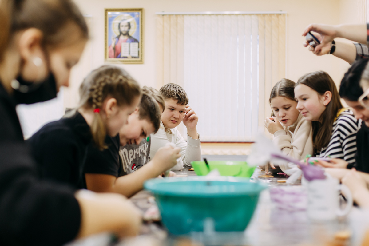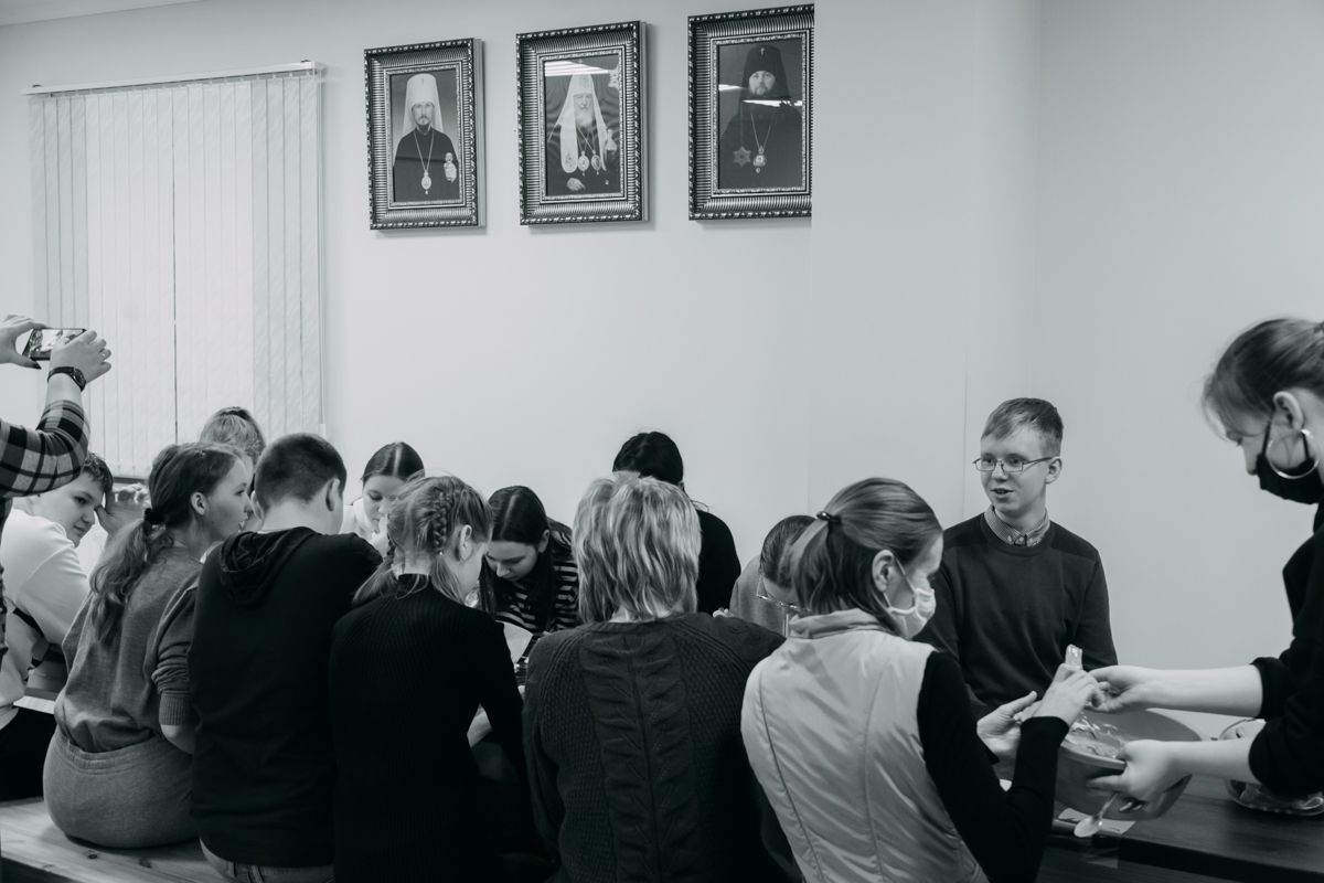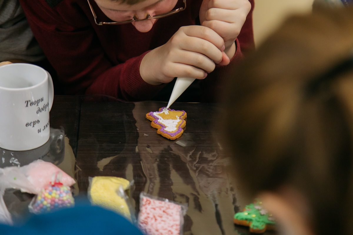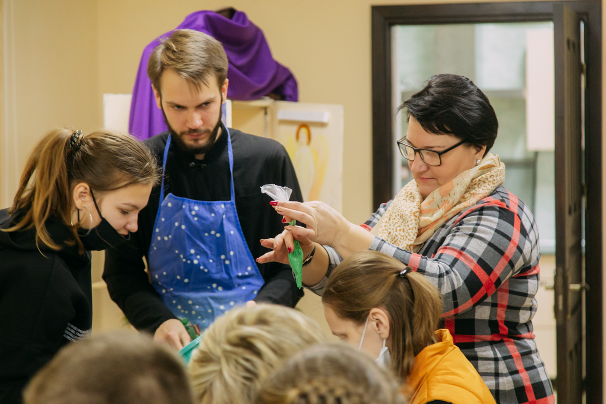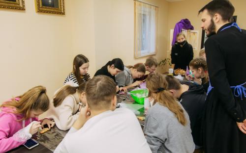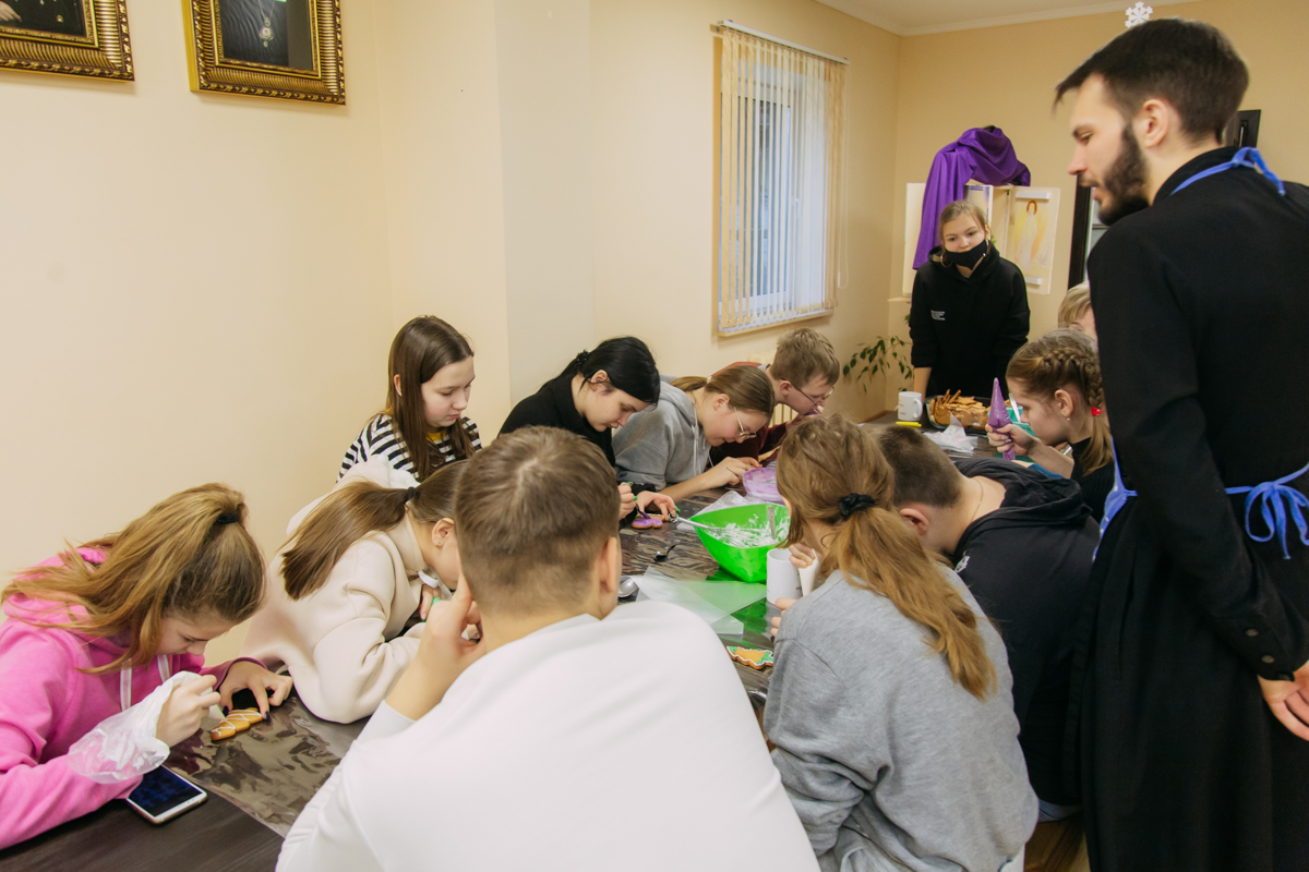 После посещения храма группа направилась в воскресную школу. Ребятам вместе с педагогами было предложен мастер-класс по изготовлению имбирных пряников, который провел священник Николай. Во время приготовления всем собравшимся священник рассказал о празднике Рождества Христова, его традициях, значении, о важности добрых дел и о Боге в нашей жизни.