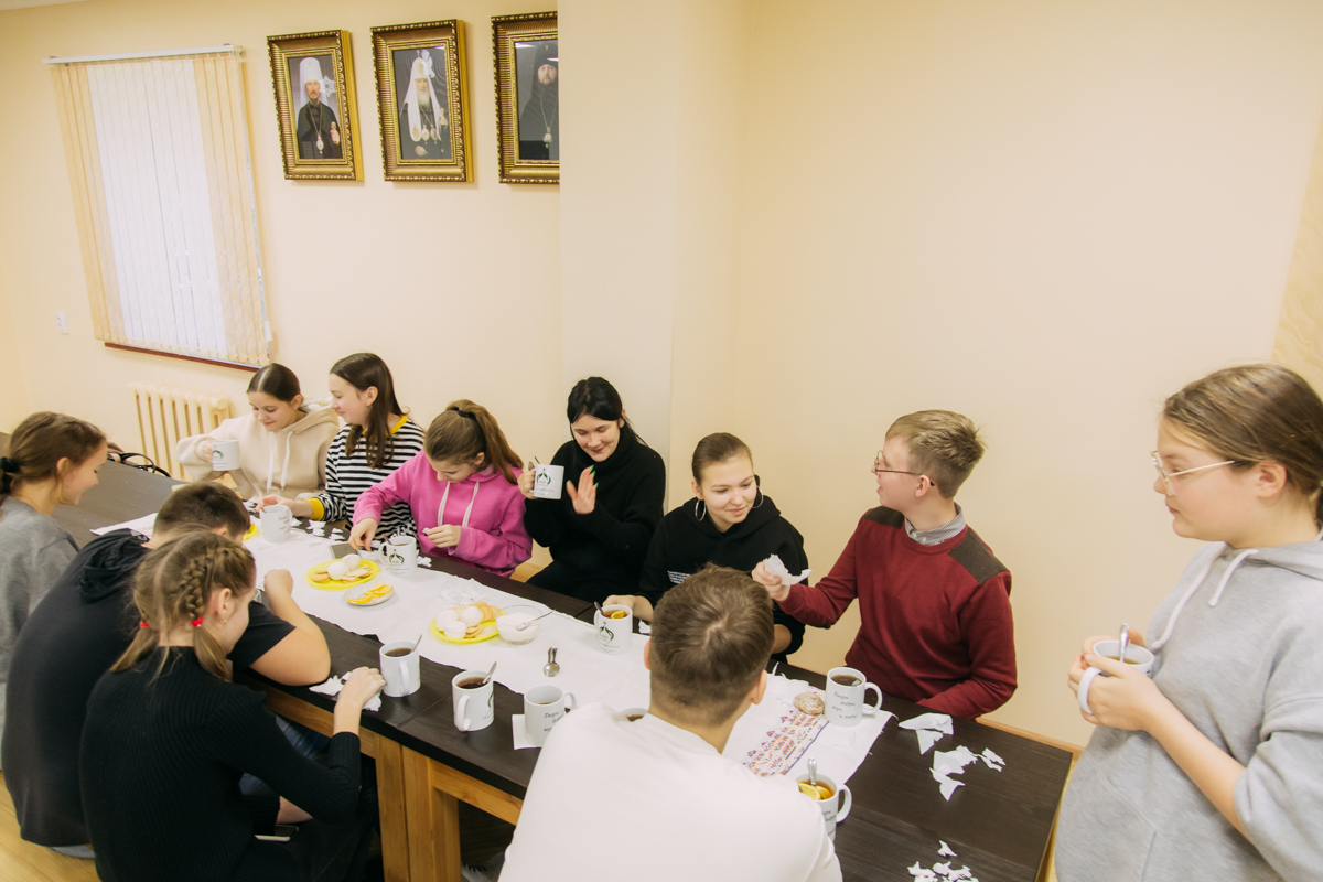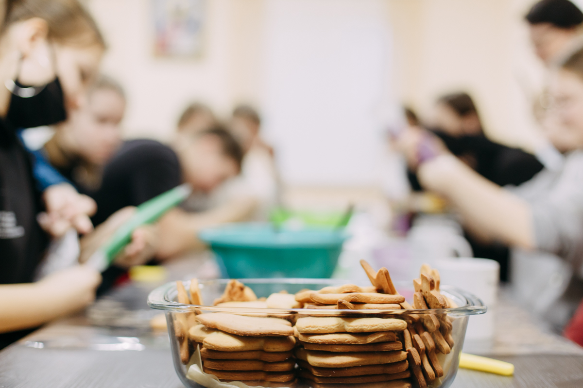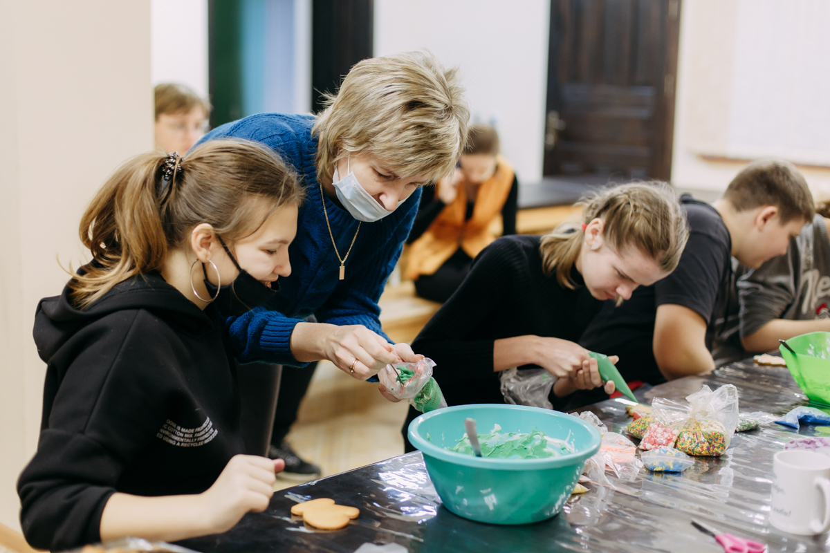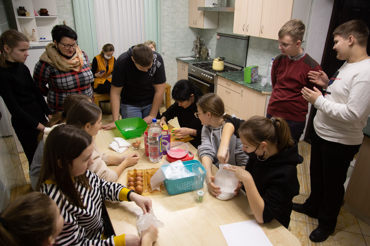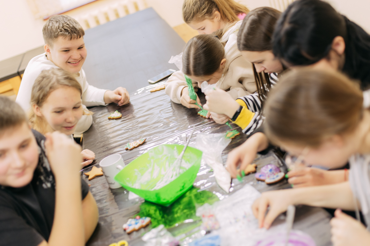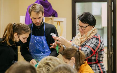 После посещения храма группа направилась в воскресную школу. Ребятам вместе с педагогами было предложен мастер-класс по изготовлению имбирных пряников, который провел священник Николай. Во время приготовления всем собравшимся священник рассказал о празднике Рождества Христова, его традициях, значении, о важности добрых дел и о Боге в нашей жизни.