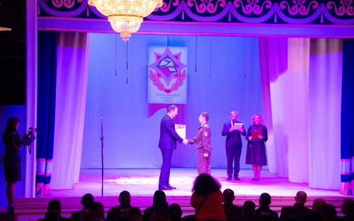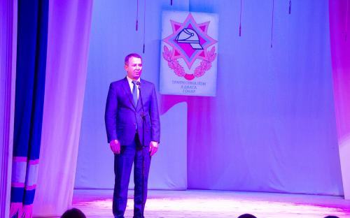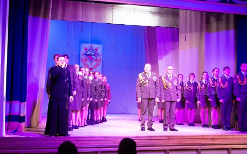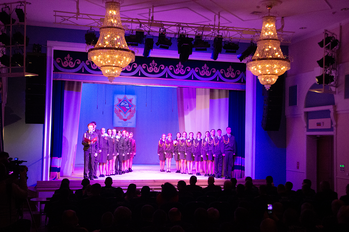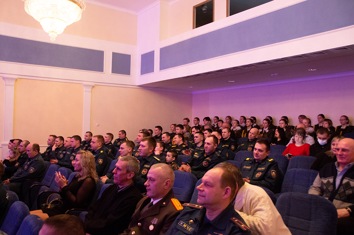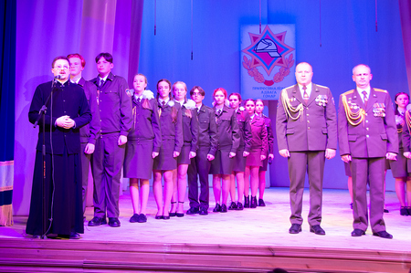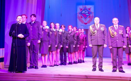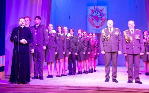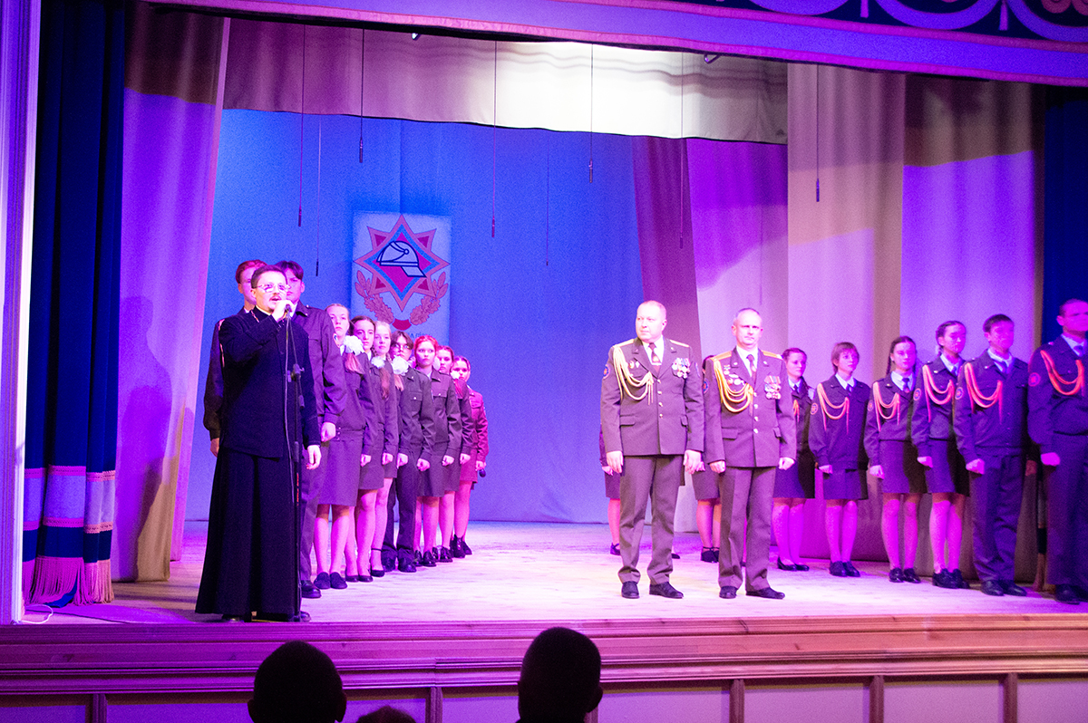 В своем выступлении священнослужитель поздравил всех собравшихся с празднуемыми событиями, пожелал сотрудникам МЧС крепости душевной и телесной, оставаться верными Богу и отечеству.  Молодым курсантам класса МЧС средней школы №10, посвящение которых состоялось на данном мероприятии, священнослужитель пожелал ни на сколько не уступать своим наставникам, а по возможности и превзойти.  В завершение выступления священник окропил учащихся крещенской водой и благословил всех присутствующих.